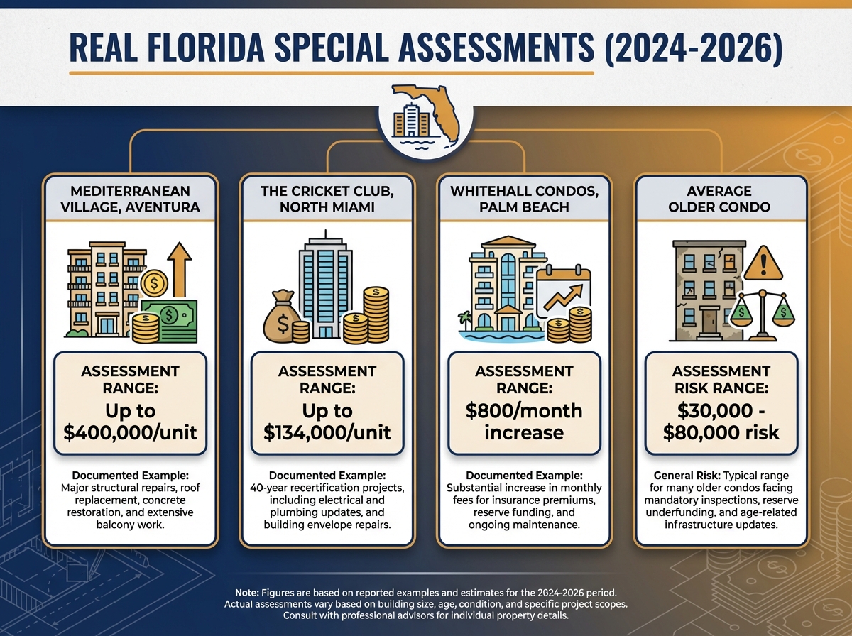 These aren't hypothetical numbers. Real Florida condos are passing real assessments right now (sources: Brosda & Bentley, Yahoo Finance):