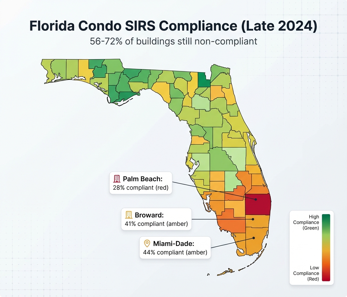 Post-Surfside laws (SB 4D, HB 913) now require SIRS reports and mandatory reserve funding. As of January 2026, reserve waivers are banned — yet 56-72% of South Florida buildings remain non-compliant.
