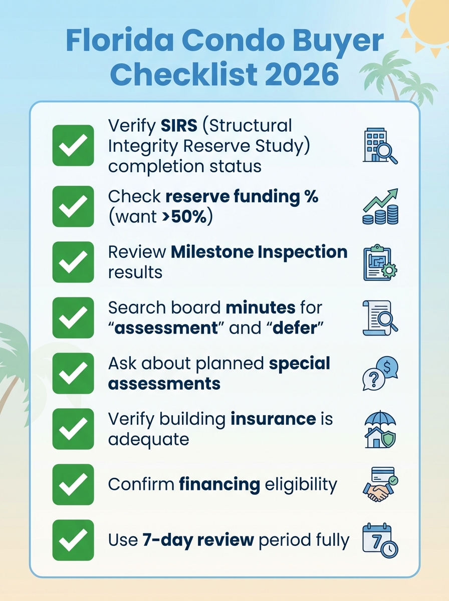 Before buying a Florida condo, verify SIRS completion status, reserve funding percentage, pending special assessments, milestone inspection results, and insurance coverage changes.