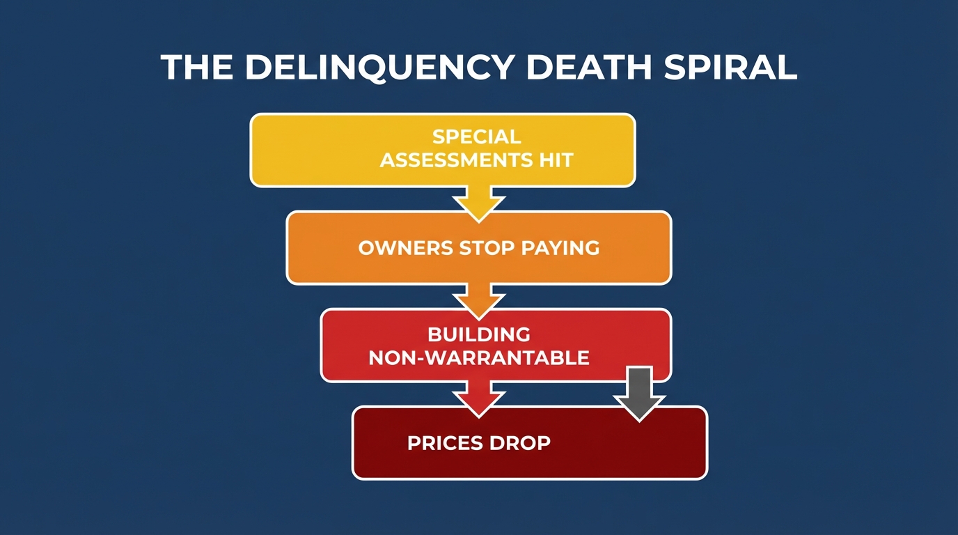 It starts with underfunded reserves. Years of deferred maintenance lead to expensive emergency repairs. The board levies a special assessment. Some owners can't afford five- or six-figure bills, so they stop paying. Delinquency climbs.