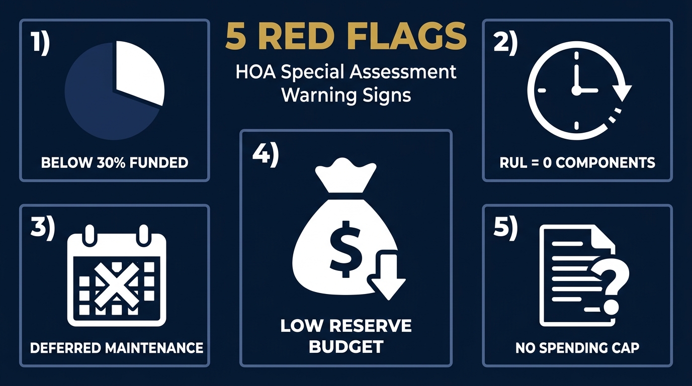 These five patterns (across the reserve study, meeting minutes, budget, and CC&Rs) consistently precede special assessments.