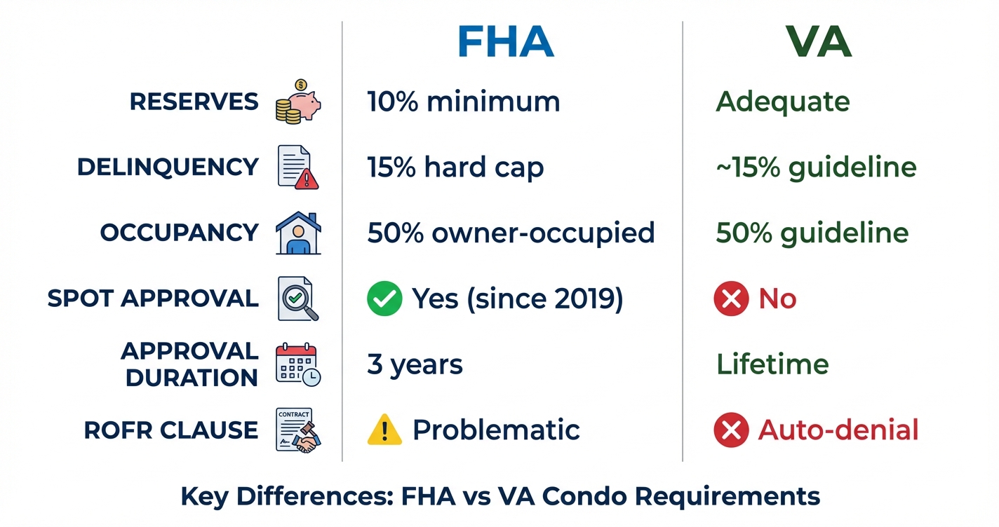 FHA offers Single Unit Approval (per-unit) while VA requires full project approval. VA prohibits Right of First Refusal and super-lien clauses, which FHA does not specifically block. FHA has stricter financial thresholds (10% reserves, 15% delinquency) while VA is less prescriptive on exact percentages but stricter on CC&R language. FHA approval expires after 3 years. VA approval is lifetime.